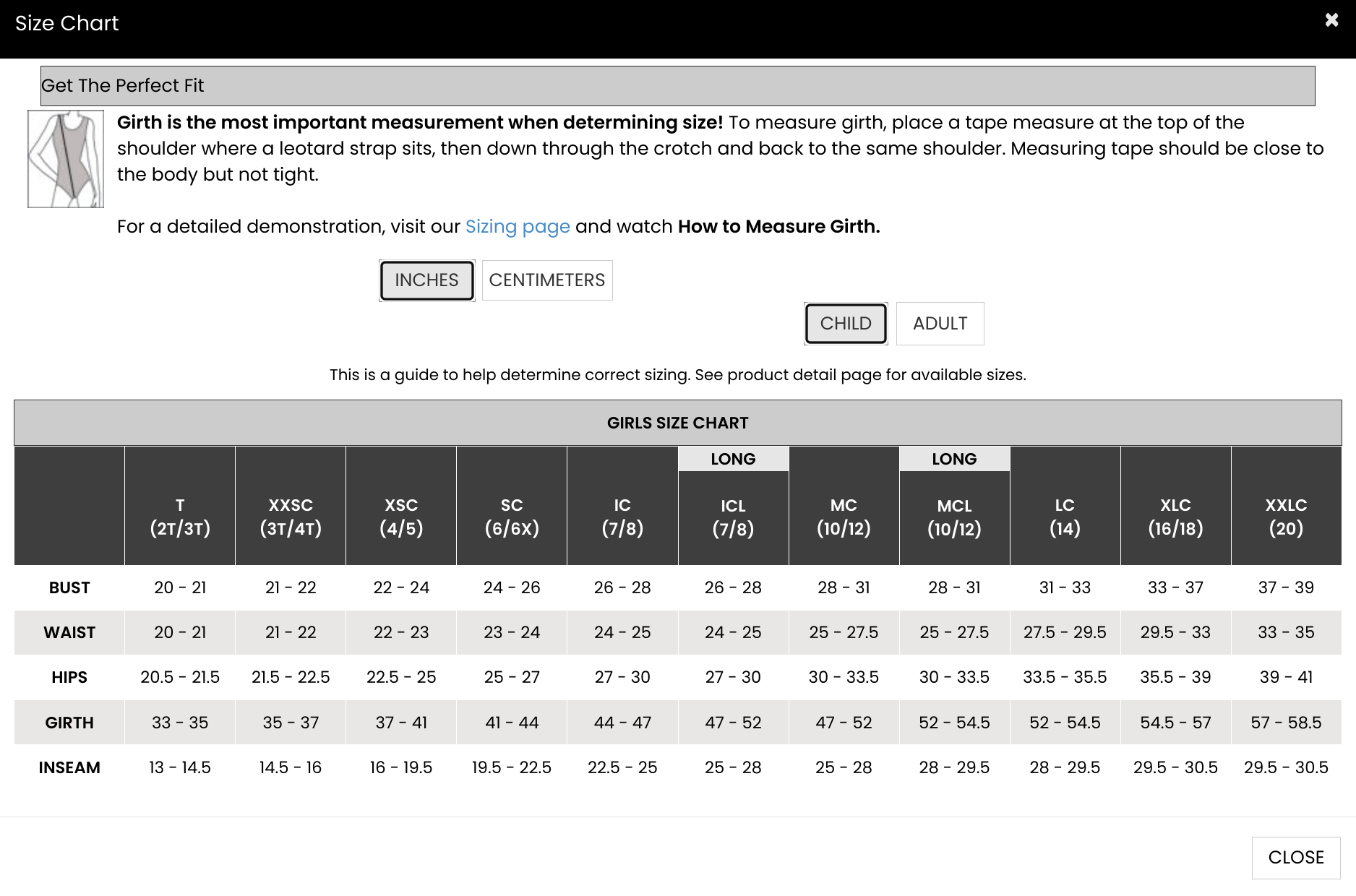 Girth is the most important measurement when determining size on one piece garments. To measure girth, place a tape measure at the top of the shoulder where a leotard strap sits, then down through the crotch and back to the same shoulder. Measuring tape should be close to the body but not tight.